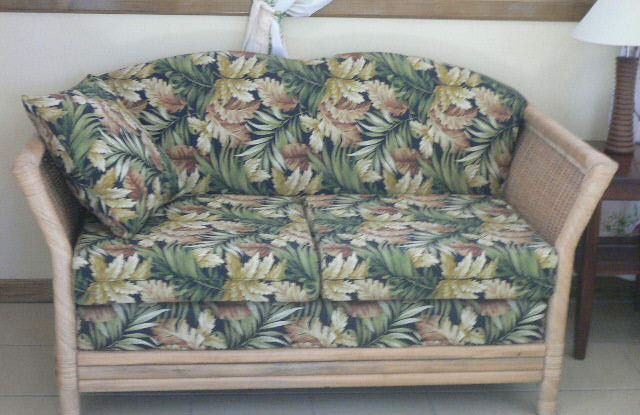Based on many of the design features from our 40'sailing boat, we were able to put a lot into an intimate space. There is a full kitchen, including mircowave, coffee maker and toaster. Of course, full time hot water is throughout, and an oversized A/C keeps everything cool on the overly warm days. Everything needed to prepare and serve a meal is place; pots, pans, flatware plates, bowls and cups. Yes a lot in a small space for sure., Two wicker fronted lockers (for better ventilation) that were custom built provide ample storage for even hanging items. A flat screen television is visible from the double bed or the love seat. Popcorn, anyone?